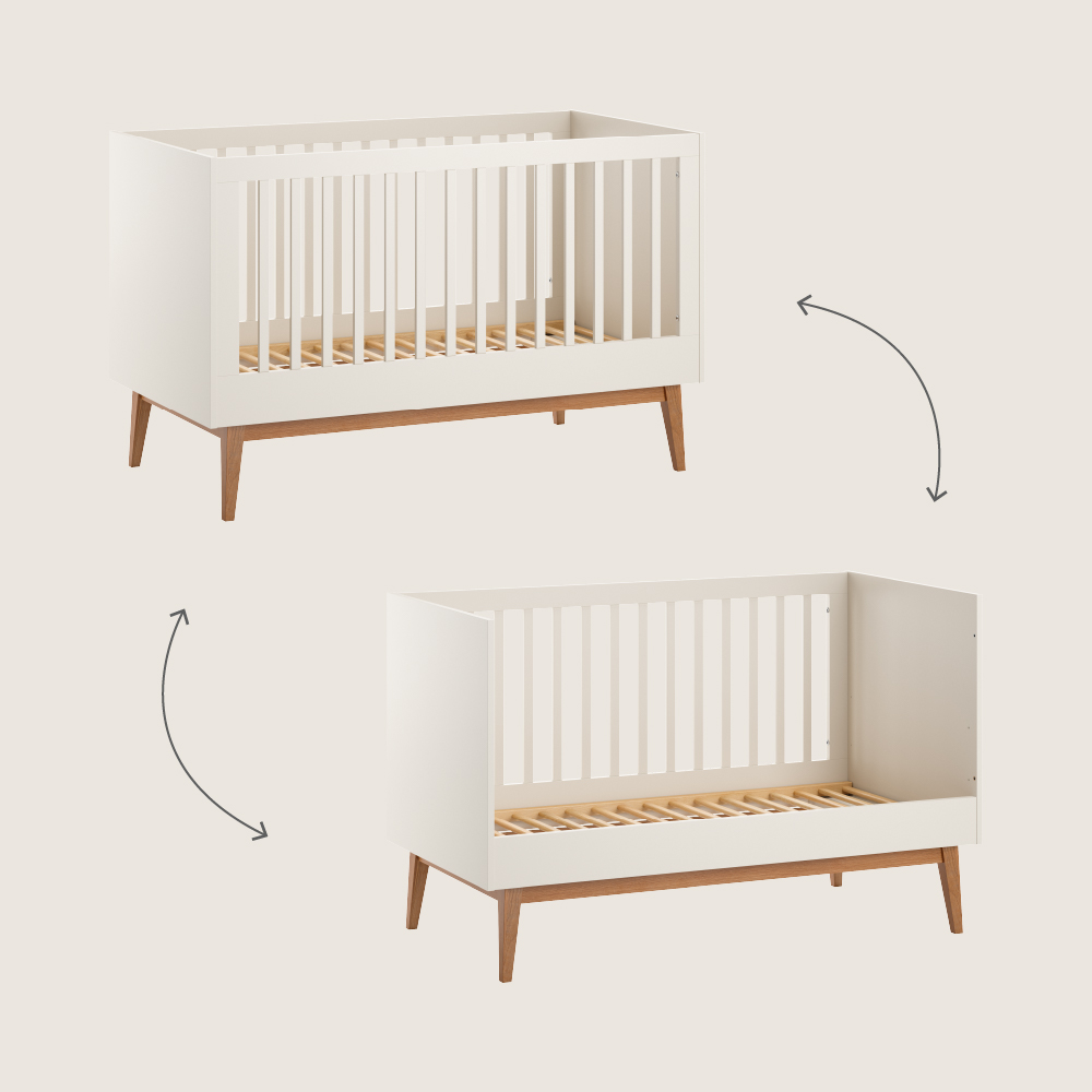 Designed for flexibility, the «Nuage» features two adjustable mattress heights and comes with a short side panel that can be placed on the left or right, depending on your room layout. As your baby grows, the cot converts into a toddler bed with ease, supporting a smooth, confident transition.